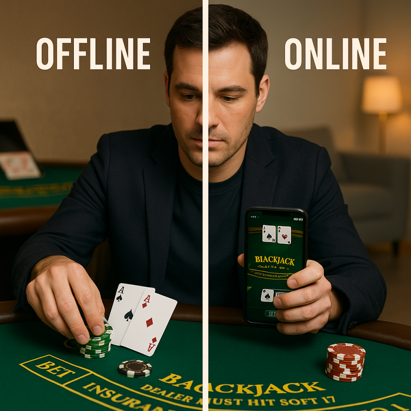 블랙잭 오프라인 vs 온라인 비교 분석: 게임 구조, 전략 효율성, 수익률, 심리전 차이까지 완전 해부